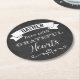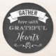 These THICK round disposable or reusable paper coasters have a black and white FAUX chalkboard look background with a white ribbon banner, a pair of scrolls and a white heart on it, along with the verse: Gather here with grateful hearts, which would make it a wonderful item to have at your Thanksgiving feast, Christmas dinner, or any event where friends and family gather. Makes a modern and trendy hostess or house-warming party gift for the young hipsters too! If you need assistance, email niteowlstudio@gmail.com.