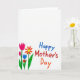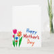 This card features a wide white space across the top, leaving the focus on a small, cozy scene near the bottom. In the lower left, a simple bouquet leans together like close friends, with a bright pink tulip-like bloom, an orange daisy-like flower with a yellow center, and a small blue bud nestled beside them ❤️. Green stems and broad leaves are shaded in a few tones, and the visible coloring strokes give the plants a soft, crayon-like texture. To the right of the flowers, the words “Happy Mother’s Day” sit along the lower area in slightly staggered, friendly lettering. “Happy” appears in blue, “Mother’s” in red, and “Day” in orange, making the message feel lively without crowding the open space. The even lighting and lack of shadows keep everything airy, like a note left on a kitchen table for someone special 👩. The bottom-left bouquet shows a pink bloom above an orange flower and a small blue bud, with layered green leaves spreading outward.