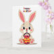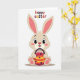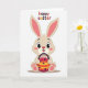 This card shows a light-brown bunny character centered on a white background, looking straight ahead with big expressive eyes, a small red nose, rosy cheeks, and a wide smile that shows one front tooth 🐰. Its tall ears are lined in soft pink, giving the face a gentle, friendly look that feels like a warm hello to someone close. The bunny sits with a slightly tucked posture, cradling a decorated egg accessory as if it’s holding a small gift for a friend 🐇. The egg features horizontal stripes in magenta, orange, and yellow with dark circular accents, and a deep purple handle that stands out against the lighter tones. Above the character, the text “hoppy easter” appears near the top, arranged in multi-colored letters that resemble a small mosaic. The open white space around the figure keeps the focus on the bunny’s tender expression and the bright egg. A faint gray shadow sits directly beneath the bunny, grounding it on the page.