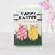 This design shows two egg-shaped forms in the center, one bright pink and the other sunny yellow, set close together like a friendly pair sharing the spotlight 🐰. Each one is dotted with small and medium white polka dots arranged diagonally, giving the surface a gentle sense of motion. At the top of each egg sits a neatly tied white bow with a thin dark stripe, like matching accessories that make them look connected. The eggs rise from a row of dark green, sharply cut grass shapes, creating a garden-like foreground with a cozy, together-in-spring feel 🌷. Near the top, a white banner stretches across with a bold dark sans-serif message placed in the middle. On both sides of the banner, jagged purple accents act like little brackets, adding contrast and framing the words. Everything sits on an off-white, lightly textured background that looks like embossed paper under soft, even lighting.