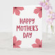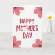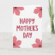 This greeting card features the words “HAPPY MOTHER’S DAY” placed prominently in the center in deep crimson-red lettering, with rounded, friendly letter shapes that feel gentle and affectionate ❤️. The message sits evenly across the middle of a bright white background, giving it lots of breathing room and making the text easy to notice at a glance. In each corner, a stylized flower adds a soft touch, like a caring gesture framing the greeting. The blossoms are a dusty-rose pink with petals spreading outward from a darker, detailed center, creating a tender contrast against the white space 🌼. The layout feels balanced and calm, like a quiet moment of closeness shared between loved ones. A faint, paper-like texture runs across the white background so the surface looks slightly tactile rather than flat. The four pink flowers sit near the corners, angled inward to frame the centered red text.