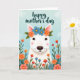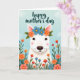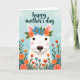 This card shows a friendly, stylized white dog centered on the front, with round dark eyes and soft pink cheeks that give it a tender, affectionate look ❤️. A crown of small blue and orange flowers rests across its head, tucked into bright green leaves like a sweet garden accessory. Along the bottom edge, a thick row of tall, slender stems rises into a field of orange, red, pink, and blue blooms, surrounding the dog like it’s being admired by a bouquet. The scene feels like a sunny spring day, with the dog’s calm forward gaze adding a gentle, companionable mood. Behind everything is a pale blue sky with light, wispy white clouds that keep the background airy and soft 🌼. Near the top, a short greeting sits centered in green lettering, standing out clearly against the sky. The flowers cluster most densely at the lower border, while the dog’s face remains open and bright in the middle of the design.