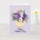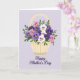 This card shows a full bouquet spilling from a classic light-toned woven basket, centered so it feels like it’s being offered with care ❤️. The flowers crowd together in a cozy, close-knit way, like friends leaning in for a photo, with soft light smoothing the edges of every petal. Purples and lavenders lead the palette, mixed with gentle pinks and crisp whites that suggest early spring and quiet affection 🌼. Each bloom has tiny yellow or deep red centers, and the green leaves tuck between them like little gestures of support. Behind the basket, faint diagonal stripes add texture, and a dotted border frames the scene without stealing attention. Near the bottom, a short message sits in dark lettering, placed neatly under the basket to balance the design. The background stays light and airy, with the stripes angling softly from one corner to the other.