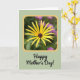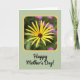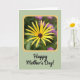 This card features a close-up floral portrait with a bright yellow bloom, thin petals fanning out from a dark, textured center, held inside a softly rounded golden frame. Behind it, deep green tones fade into a gentle blur, with soft magenta hints that feel like distant flowers leaning in like close friends ❤️. The lighting looks warm and mild, giving the flower a cared-for glow, like someone admiring it with a tender, lingering gaze. Near the bottom, the text “Happy Mother’s Day!” sits centered and slightly spaced from the floral image, standing out in black lettering. The background is a pale sage green with a faint texture that adds depth without distracting from the main image 🌼. The yellow, green, and touches of purple create a calm, affectionate garden mood, as if the scene is offering a quiet thank-you. A thin golden border surrounds the floral window, and the main background shows subtle diagonal lines running across it.