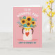 This design shows a white pitcher filled with a generous bouquet of flowers, set on a smooth, even pink background. Four large golden flowers with deep, dark centers stand out first, like they’re leaning in together the way close friends do ❤️. Around them, smaller teal-blue blossoms and thin green-and-aqua sprigs weave through the arrangement, adding a gentle, companionable closeness. The pitcher has a light, grainy texture and a golden polka-dotted ribbon tied into a tidy bow just under the rim. A textured red heart sits front and center on the pitcher, giving the scene a softly romantic focus without needing any characters. Short lines of text appear at the top and bottom in a rounded, friendly style, colored in a dark tone that reads clearly against the pink 🌼. The top line sits centered above the bouquet while the bottom line is centered beneath the pitcher, and the heart shows a slightly rough, painted look with uneven edges.