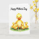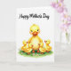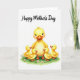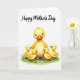 This Mother's Day card features a large yellow-feathered mother bird at the center, smiling with rosy cheeks and long lashes as four smaller chicks cuddle close around her like a little circle of affection ❤️. Their bright eyes tilt upward toward her, and the way their tiny orange beaks point in her direction makes the scene feel tender and close-knit. Soft shading across the golden feathers gives a cozy, plush look, as if you could almost feel the downy texture. The group stands on a patch of rich green grass dotted with tiny pale pink flowers, adding a gentle springtime setting 🌼. Above the illustration, a flowing message is placed near the top in a dark, graceful lettering style that contrasts clearly against the white space. The background stays mostly white, letting the warm yellows and fresh greens stand out without distraction. Light, diffused highlights fall across the feathers and cheeks, giving the characters a soft glow. Small pink blossoms are scattered across the grass beneath their feet.