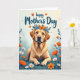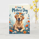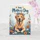 This greeting card features a golden-furred dog resting low in a bed of leafy groundcover, facing forward with soft, soulful eyes that feel like a loyal friend’s steady gaze ❤️. A floral crown circles its head like a gentle embrace, made of rich orange blooms, small teal flowers, and deep green leaves that lean in close around its ears. Around the dog, stylized flowers in orange and white rise on slim stems, creating a spring garden setting that suggests quiet companionship. The background fades from light teal into creamy white, like morning light drifting across the scene. Near the top, a short message appears in dark teal lettering, centered above the dog and spaced to leave plenty of airy room. Warm oranges and cool teals balance each other, and the relaxed paws and calm posture add a tender, affectionate mood to the illustration 🌼. Small petal details and fine fur texture are visible, and the wreath’s orange blossoms stand out against the soft teal-to-cream gradient behind them.