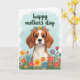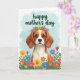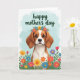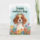 Designed with a sweet brown-and-white dog at the center, the illustration highlights long floppy ears and big dark eyes that seem to gaze up with gentle affection, like it’s sharing a quiet moment with someone it trusts ❤️. A flower crown rests on its head, woven with small blooms in red, yellow, blue, and purple that soften the scene with a friendly, romantic touch. Across the lower part of the card, a field of matching flowers spreads outward on thin green stems, as if offering a bouquet from the foreground. The background is a light sky-blue wash with faint, cloud-like texture that keeps everything calm and airy. Near the top, a short message appears in flowing green lettering, centered above the dog’s head. Soft, diffused lighting brightens the fur and petals, giving the whole image a gentle glow 🌼. The flowers at the bottom form a colorful band, with reds and yellows standing out against the cool blue background.