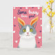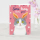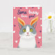 Designed with a cute cartoon-style cat face filling the lower half, this card features soft white fur with cool gray patches and a plush-looking texture. Oversized floppy bunny ears sit on top like a costume, with orange-yellow inner ear color that stands out against the gentle fur tones 🐰. The cat’s big yellow eyes with narrow pupils meet the viewer with a tender, friendly look, helped along by a rosy cheek blush, a small pink nose, and a slight smile. A bright pink background sets a cheerful scene, sprinkled with small heart shapes in white and deep plum that suggest affection and close companionship. Near the top, the phrase “Some bunny loves you!” appears in flowing lettering, arranged above the character so it feels tied to the bunny-ear gag 🐇. The text is light-colored for strong contrast, and it sits centered so the message reads clearly before your eye drops to the character’s face. White and plum hearts are scattered across the pink background around the lettering and above the ears.