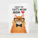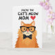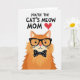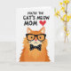 Designed with a friendly digital illustration, this card features an orange, human-like cat centered on a bright white background, with soft, fluffy-looking fur shapes that suggest a cozy cuddle. The cat wears oversized black-rimmed glasses that give it a thoughtful, sweet look, as if it’s sharing a private joke with someone it adores ❤️. A black bow tie dotted with small white circles sits neatly under its chin, adding a dressed-up touch that feels affectionate and proud. The cat’s gentle smile and fine whiskers frame wide eyes that seem to meet yours with warm attention. Across the top, the message “YOU’RE THE CAT’S MEOW MOM” appears in thick, simple black letters, spaced evenly so it reads clearly at a glance. A small red heart sits near the wording, adding a tender accent without crowding the design 🌼. The overall layout stays uncluttered, with the orange cat and its dark accessories standing out sharply against the plain white space.