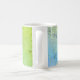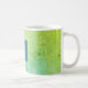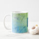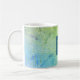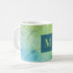 This coffee mug offers an elegant design in teal and green and is accented with geometric lines of light green faux glitter. A dark teal box, in the center, offers a custom monogram.