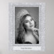 This poster/portrait is shown on quality value poster paper. As always, you can upgrade your paper for a few bucks more and has fun and flashy silver color faux glitter-look around the border of the photograph. Customize this item and change the sample photo to yours and change the text to yours with your name or title on the text box resembling a name plate.