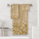 Easily personalize this trendy chic bath towel set design featuring pretty gold sparkling faux glitter on a gold brushed metallic background.