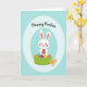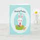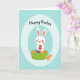 Designed with a friendly spring scene, this card features a white bunny with long ears and rosy cheeks, holding a patterned egg close as if sharing it with someone special 🐰. In front, a bright green woven basket is filled with colorful decorated eggs, and the bunny’s gentle gaze adds a tender, companionable mood to the moment. To the side, a small yellow chick with an orange beak stands nearby, looking up with curious attention as if joining in. The main illustration sits inside a pale light-blue oval frame that feels soft and airy, set against a slightly deeper teal background. Near the top, a short Easter greeting appears in a flowing, handwritten-style font in a darker teal-blue, centered above the characters. Pastel tones mix with lively accents on the egg patterns, with dots, stripes, and zigzags that add spring energy 🌷. The bunny’s paws wrap around the egg while the basket’s weave is shown with simple crossing lines and shaded green bands. The final detail shows the light-blue oval border floating neatly in the middle of the teal field, with the greeting tucked just above the bunny’s ears.