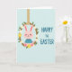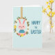 This card features a pink bunny with a rounded head, tall ears, and rosy cheeks, smiling softly as if greeting someone special 🐰. The bunny wears a blue top with horizontal stripes and sits cozily inside a circular wreath, giving the scene a sweet, close-to-the-heart feel. The wreath is made of thin brown branches and dotted with small white daisy-like blooms and sunny yellow flowers tucked among bright green leaves 🌷. A braided rope hangs from the top, holding the wreath like a gentle swing in midair. The background is a pale, airy blue that keeps everything light and springlike while making the pink, white, yellow, and green colors stand out. On the right side, the text reads “HAPPY 1st EASTER” in uppercase letters, set in a strong, friendly style and spaced to balance the illustration. The words appear in a dark tone that contrasts clearly against the blue background, sitting to the right of the wreath rather than overlapping it. The bunny’s small blush marks and the wreath’s tiny petals are drawn with smooth outlines that keep the details neat and easy to see.
