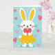 This card features a simple white bunny character centered on a soft pastel blue background, holding a red heart close as if offering it to a dear friend 🐰. Its long ears have warm yellow interiors dotted with tiny white spots, and its small black eyes, tiny nose, faint whiskers, and rosy cheeks give it a tender, affectionate look. The bunny wears a marigold-yellow dress with a scalloped hem and small white dots, adding a sweet, cozy touch to the scene. A fluffy white tail peeks out behind the dress, reinforcing the soft, cuddly silhouette. Across the background, small hearts in pinks and reds float around the bunny like gentle reminders of closeness and shared affection 🌷. Any greeting text would sit neatly near the top or bottom in a simple pink or red font that matches the hearts without overpowering the character. The scene stays airy and uncluttered, with the bunny and its heart clearly framed against the open blue space. Scattered hearts of different sizes drift across the blue field, with deeper red shapes mixed among lighter pink ones.