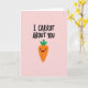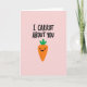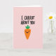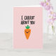 This greeting card features a soft pastel pink background that sets a gentle, friendly tone. Near the top, large black lettering reads “I CARROT ABOUT YOU,” spaced to stand out clearly against the open backdrop. The phrase adds a sweet, flirty touch, like a private joke shared between close friends or a couple. Below the text sits a cute orange carrot character with a smooth, tapered shape and a leafy green top, giving it an easygoing, approachable presence 🐰. Its face is simple with two small black dot eyes and a small curved smile that feels warmly directed at the viewer. Light horizontal marks across the carrot add a bit of texture without crowding the design 🌷. The composition keeps plenty of breathing room, with the dark text above and the bright carrot centered beneath it on the pink field.