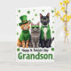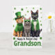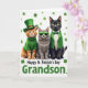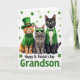 Designed with three dressed-up cats posed front and center, this St. Patrick’s Day card sets them against a white background sprinkled with small green shamrocks like confetti 💚. On the left, a ginger tabby with sky-blue eyes wears a green leprechaun top hat and a knitted green turtleneck, topped off with a tiny gold heart that feels like a quiet little love note. In the middle, a fluffy gray tabby leans into a cool, close-friend energy, its eyes hidden behind emerald-green sunglasses as if sharing an inside joke ☘️. On the right, a sleek black cat with golden eyes stands tall in a green blazer over a white shirt, finished with a neat green bow tie that makes the trio look like they arrived together. The mix of ginger, gray, and deep black fur pops against the shared green accents, tying them into one cozy scene. Along the bottom, the message “Happy St. Patrick’s Day Grandson” sits as a single line of text, set in green to match the shamrocks. Around them, the shamrocks are scattered evenly across the white space, framing the cats without crowding them.