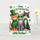 This card shows three dressed-up cats sitting side by side on a white background sprinkled with small green shamrocks, giving the scene a friendly, close-knit feel 💚. On the left, a ginger cat in an emerald top hat with a shamrock buckle and a ribbed green sweater looks over with wide green eyes, as if sharing a quiet joke with the others. In the middle, a grey cat wears oversized lime-green sunglasses and holds a small, knowing smirk that suggests an easy bond between friends. On the right, a black-and-white tuxedo cat poses in green shades, a neat green bow tie, and a green-collared jacket with matching green buttons, leaning into the group like it belongs there ☘️. Across the top, the words “Happy St. Patrick’s Day” appear in green lettering, arcing above the trio. Near the bottom, “Little Brother!” is written in green, centered beneath the cats to anchor the layout. The clothing details stand out, from the sweater’s visible knit texture to the glossy reflections on the sunglasses. Tiny shamrocks dot the space around their hats and shoulders, with plenty of white space keeping the trio clearly in focus.