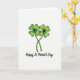 Designed with two four-leaf clovers as the main focus, this St. Patrick’s Day artwork keeps the scene airy on a white background. Each clover is painted in layered greens, from spring green to deeper forest tones, with small touches of warm yellow near the centers that make them look softly lit 💚. The rounded leaves have a gentle, heart-like shape, and the pair sits close enough to feel like a quiet nod between friends. Their slim stems cross near the bottom, like an easy handhold that suggests shared luck ☘️. Centered beneath the clovers, the words “Happy St. Patrick’s Day” appear in dark ink, set in flowing, connected lettering. The text sits low on the page with plenty of open space above it, letting the green shapes stand out. The final detail is the subtle gradient on each leaf, where the color fades from lighter edges into richer green toward the middle.