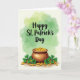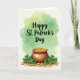 This greeting card features “Happy St. Patrick’s Day” across the upper area in flowing dark green lettering, set over a soft wash of green watercolor that fades from emerald to lime. The background glow feels like a gentle spotlight, giving the message a warm, friendly presence 💚. Below the words sits a sturdy brown clay pot with subtle texture, angled as if it’s just been set down by someone close. Golden coins spill out in a loose trail, catching tiny highlights that make them look freshly tumbled. Nestled among the coins are several four-leaf clovers in rich green, their leaves shaded with fine veins that invite a closer look ☘️. The arrangement feels like a shared little treasure—coins and clovers scattered as if two friends laughed and nudged the pot together. The lower portion is filled with warm browns, golds, and green clovers clustered near the base of the pot, with a few coins resting along the ground in front.