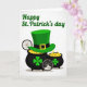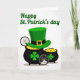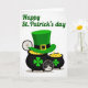This card features a white background with an emerald-green leprechaun top hat centered near the top, wrapped with a black band and a gold buckle that catches the eye. Below it sit two rounded black cauldrons, close enough to feel like companions, each spilling shiny gold coins that seem to tumble toward one another in a friendly, shared jackpot ☘️. Each pot is decorated with green shamrocks on the front, adding a lucky touch without crowding the scene. Two bicycle wheels add a light, romantic hint of a shared ride—one wheel peeks out behind the larger left pot, while the other rests beside the smaller right pot as if it just rolled up to join the celebration 💚. The phrase “Happy St. Patrick’s day” appears above the hat in green lettering, centered and spaced to frame the illustration. The green text ties neatly to the hat and shamrocks while the gold coins bring warmth against the dark pots. The final detail is the right wheel leaning near the smaller cauldron, its thin spokes drawn in a simple circular pattern.