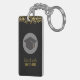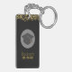 A keychain which says: Class of 20xx. The back can be personalized with your name and phon number or other text. Designed with fake gold confetti glitter. Set on a black background. Illustrated with a black graduation cap with a semi-transparent circle behind. Elegant and chic.