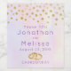 Wedding wine bottle label with fake gold confetti sprinkled along the top. 2 golden wedding rings below your personalized text. A pale purple and yellow watercolor background.