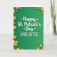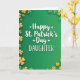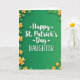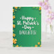 On the front of the card, a rich green gradient fills the background, darker around the edges and lighter toward the center, like a soft spotlight on the message. Centered in white text, “Happy St. Patrick’s Day” sits above “Daughter,” with the top line in a flowing, brush-like lettering and the bottom word in a steady, simple sans-serif. Small white arrows tuck in near parts of the main phrase, gently guiding your eye from one word to the next as if leading you through a warm greeting. Around the outer edges, shamrocks and four-leaf clovers scatter like confetti, alternating between deep emerald and shiny gold ☘️. Subtle shadows under each clover give a layered, cut-paper look, adding depth without crowding the center. The layout feels affectionate and close, as though the words are leaning in toward “Daughter” with a fond, proud emphasis 💚. Gold clovers pop against the green field, while the white lettering stays crisp and easy to spot in the middle of the design.