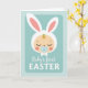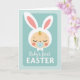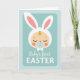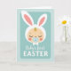 This card features a sleeping baby’s face in warm cream tones with rosy cheeks, resting inside a pale aqua rounded rectangle on a lighter background dotted with tiny circles. A fluffy white bonnet frames the head with a scalloped edge, and two long bunny-like ears rise above it with soft pink inner details 🐰. A small golden curl with a tiny green sprout sits on the forehead, adding a gentle spring touch 🌷. The baby’s closed eyes and relaxed expression suggest a tender, affectionate moment, like a quiet cuddle shared with family or close friends. A light blue pacifier with a small heart detail sits in the baby’s mouth, reinforcing the soft, caring mood. Beneath the illustration, the words “Baby’s first EASTER” are centered in neat lettering, with “EASTER” in uppercase and the text set in a medium blue tone. The overall palette stays in pastel blues, greens, pinks, and creams, and the rounded rectangle is bordered by a faint inner edge against the polka-dotted field. The ears extend upward past the top of the rectangle, with the pink lining clearly visible inside each ear.