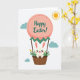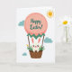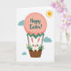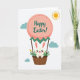 This card shows a white, long-eared bunny with dark, shiny eyes, rosy cheeks, and a small red smile peeking out of a woven brown basket, looking as if it’s sharing a sweet moment with whoever’s watching 🐰. The basket is packed with leafy green plants and an orange root vegetable, adding a cozy, garden-fresh touch. Above it floats a round, pastel pink balloon dotted with darker pink circles, lifting the basket like a gentle spring ride. Across the balloon, the words “Happy Easter!” sit centered in emerald green lettering, standing out clearly against the pink. The background stays bright white, giving the scene lots of open space and an airy, friendly feel 🌷. Soft sky-blue clouds drift nearby, making the bunny’s upward trip feel calm and light, like a quiet adventure with a warm, companionable grin. In the upper right corner, a stylized golden sun with simple rays glows over the balloon and basket.