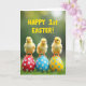 This design shows three fluffy yellow baby birds perched in a row on decorated eggs, their bright eyes angled toward one another as if sharing a tiny, friendly secret 🐣🌷. Behind them sits a softly blurred outdoor scene with rich green tones and a gentle glow, like early spring light filtering over grass. The eggs beneath the birds shine with a glossy finish, including a red one with white polka dots, a sky-blue one with beige spots, and a sunny yellow one marked with blue circles. The warm yellow feathers stand out against the cooler blues and greens, while the repeated dots and spots tie the trio together like a matching set. Their close spacing and slight head tilts give the moment a tender, companionable feel, as though they’re keeping each other steady on the curved shells. Near the top, the message “HAPPY 1st EASTER!” appears in large yellow letters, centered and easy to read against the darker, blurred background 🐰. A few blades of grass frame the lower edge, and the eggs’ reflective highlights catch the light in small white gleams.