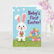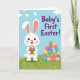 This card shows a fluffy white bunny with pink-lined ears, big blue eyes, and rosy cheeks, smiling as it holds a small woven basket close like it’s sharing a sweet moment with someone nearby 🐰. A stream of decorated eggs spills down the right side, filling the space with soft shades of rose, mint, sky blue, orange, and sunny yellow. Each egg has its own pattern—stripes, dots, and tiny shapes—so the design feels like a friendly little exchange of treats. Across the upper right, the message “Baby’s First Easter!” appears in deep purple lettering that stands out against the sky. The background is a light blue sky with rounded white clouds and three small white birds flying upward, adding a gentle, airy touch 🌷. Below, rolling green hills stretch across the bottom with scattered small pink flowers that echo the bunny’s blush. Soft shading gives the bunny’s fur a cushioned look, and the basket’s woven lines are drawn with simple texture. The egg cascade on the right is arranged in a dense, colorful column with varied patterns and pastel tones.