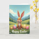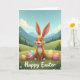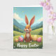 This card shows a sweet bunny with soft orange fur and extra-long ears sitting calmly on bright green grass, its wide dark eyes and open smile giving it a friendly, welcoming look 🐰. The bunny’s relaxed pose and gentle expression feel like it’s sharing a quiet moment with the viewer, like a small springtime hello between friends. Around it are four decorated egg shapes in pastel pink, blue, and yellow, arranged nearby like companions in the scene. Each egg has simple patterns such as stripes, dots, and zigzags that add texture without crowding the page. Behind the grassy foreground, the landscape rolls into tree-covered hills and then fades toward pale mountains under a light blue sky. Small yellow circles and tiny white sparkles float across the sky, adding a soft, dreamy touch 🌷. The words “Happy Easter” appear near the lower portion of the design in a flowing, dark-colored style that stands out against the grass and blossoms. White little flowers are scattered in the grass around the bunny’s feet, with the pastel eggs set just to either side.
