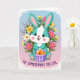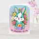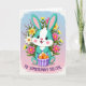 This card shows a cute rabbit-like figure in turquoise and soft white, with pink inside its long ears and on its paw pads, smiling with rosy cheeks and bright dark eyes 🐰. It holds a lavender basket with gentle stripes, and the careful way its paws curl around the handle feels like it’s offering a small gift to someone close. Inside the basket sit several orange, egg-shaped treats that glow against the cooler colors. Around the character, a ring of spring flowers blooms in yellow, fuchsia, and white, dotted with green leaves and a few purple sprigs 🌷. The background fades from sky blue at the top to a blush pink near the bottom, like a calm morning sky. A soft, cloud-like white border frames the whole scene. Along the lower edge, a short greeting appears in a flowing, hand-lettered style in a dark tone that stands out against the pale background, with the floral halo circling behind the bunny’s head.