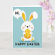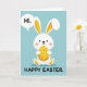 This card shows a white, long-eared bunny centered on a light blue background, sitting calmly like it’s waiting to greet a friend 🐰. Soft yellow fills the inner ears, and small black eyes with a tiny nose give the face a gentle, affectionate look. Faint pink cheeks add a shy warmth, as if the bunny is blushing during a sweet hello. The bunny holds a sunny yellow egg close to its chest, dotted with white circles in different sizes, suggesting a shared springtime treat 🌷. Near the top left, a speech bubble floats above the bunny’s ear with the word “Hi.” in a rounded, dark type style. Along the bottom edge, the words “HAPPY EASTER” stretch across in large, celebratory letters that stand out against the blue. A small, soft shadow sits directly under the bunny, grounding it on the page.