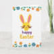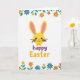 Designed with a bright white background, the card centers on a friendly bunny figure with a round sunny-yellow head and long ears lined in soft pink 🐰. Its face is kept simple with small black dot eyes, a gentle curved smile, and two thin brown whiskers that give it a sweet, approachable look. A tiny yellow bow tie sits under the face, adding a neat touch that feels a bit like dressing up for someone special. Along the top and bottom edges, a border of stylized flowers and leafy stems frames the scene, mixing orange, blue, and yellow blooms with fresh green foliage 🌷. The layout feels like a spring garden wrapping around the bunny, as if it’s being presented with affection from all sides. Beneath the character, the word “happy” appears in purple lettering, with “Easter” placed right after it in golden yellow to echo the bunny’s color. The floral clusters are densest near the corners, with scattered petals and leaves extending inward toward the center.