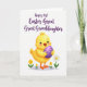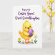 This card shows a plump baby chick in soft yellow standing on a white background, surrounded by a small patch of ground and spring flowers 🌷. Tiny orange feet rest near a white daisy with a golden center and a few smaller yellow blooms on green stems, setting a gentle garden scene. The chick’s large dark eyes and rosy cheeks give it a tender, friendly look, as if it’s sharing a sweet moment with the viewer. One wing stretches forward to hold a purple Easter egg with lighter lavender stripes, like a small gift offered with care 🐰. Above the illustration, the message “Happy 1st Easter Great Great Granddaughter” is placed near the top in flowing deep purple lettering. Soft shading and light highlights add a smooth, slightly rounded look to the chick, the petals, and the egg. The egg sits close to the chick’s chest, angled slightly to the right, with the stripes wrapping evenly around its curve.