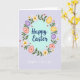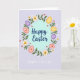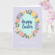 This card features a soft spring illustration centered on a light teal-blue oval with the words “Happy Easter” in deep blue flowing lettering. A full circular wreath wraps around it, built from leafy green sprigs and sprinkled with daisy-like flowers in white with warm yellow centers, plus tiny golden blooms and small white star shapes 🌷. Tucked into the greenery are decorated eggs in gentle lavender, sunny yellow, and peach, some dotted with speckles and others marked with small heart shapes. Little red hearts are scattered through the wreath, adding a sweet, affectionate touch like a quiet note shared between close family or friends 🐰. The background stays a pale lavender, keeping the scene soft and calm. Near the bottom, the line “Daughter & Son in Law” appears in small white flowing lettering, centered beneath the wreath. The wreath’s eggs and flowers form a neat ring around the teal oval, with red hearts peeking between leaves and petals.