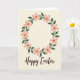 This card features a circular floral wreath filling the upper two-thirds, framing a calm open space that feels like it’s waiting for a sweet note between close friends. The flowers are stylized with five blush-pink petals each, softly shaded for a rounded look, and their warm brown centers hint at a cozy, affectionate tone. Fine golden-yellow stamens spread outward from each center, adding tiny sparks of color like little shared smiles. Slender winding stems link the blooms together, dotted with small deep forest-green leaves that add contrast and a fresh spring touch 🌷. The background is a smooth, light cream, keeping everything airy and gentle while letting the wreath stand out. Along the bottom, the words “Happy Easter” sit centered in flowing brown lettering that matches the flower centers, like a warm sign-off to someone you care about 🐰. The wreath’s blush petals and green leaves circle neatly above the brown text on the cream backdrop.