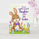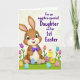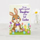 This card shows a brown-furred cartoon rabbit standing in a grassy green patch, wearing a purple bow tie and smiling with big blue eyes and two front teeth, as if posing proudly for someone close. Pastel oval eggs with stripes, dots, and crosshatch patterns are scattered around the rabbit, turning the ground into a gentle springtime search scene 🐰. Slender tulips rise behind them in lilac, coral, and soft sky-blue, adding height and a garden feel. Two fluffy little birds, one bright yellow and one warm orange, sit nearby with tiny bows, leaning toward each other in a sweet, friendly way 🐇. The background is a creamy off-white with faint swirling floral motifs that keep the scene light and airy. In the upper right, the message “For an eggstra-special Daughter on her 1st Easter” appears in deep violet lettering inside a soft, cloud-like outline. The text sits above the rabbit and flowers, leaving the center area open so the characters and eggs stay easy to notice. Small decorative swirls around the lettering echo the pale floral pattern in the background.
