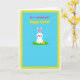 This greeting card features a sweet white bunny with rounded shapes, pink inner ears, tiny black dot eyes, and rosy cheeks, giving it a shy, friendly look 🐰. The bunny sits on a bright green patch of grass against a wide sky-blue background, like a calm spring morning. Tucked beside it in the grass is a yellow egg with neat horizontal stripes, adding a little “found treasure” moment that feels like it’s meant to be shared. A scalloped lime-green frame wraps around the blue panel, set against a pale outer margin that makes the center scene stand out. Near the top, the phrase “for a special girl” appears in a flowing rose-pink style, placed above the main greeting. Just below it, “Happy Easter!” is written in sunny yellow letters that are thicker and easy to spot, creating a cheerful contrast with the blue sky. The simple, flat illustration style keeps the focus on the bunny and egg, and the gentle blush and close spacing between them suggests a tender, affectionate note of friendship 🌷. The lime-green scalloped border surrounds the light blue center panel, with the yellow striped egg resting low in the grass beside the bunny.