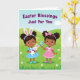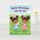 This design shows two stylized young girls standing close together on rolling green hills beneath a soft blue sky, with a tender, friendly closeness in the way they lean toward one another 🌷. The girl on the left wears upright bunny-ear accessories 🐰 and a bright blue dress with small dots, holding a white plush bunny with a purple ribbon snug against her chest. Her companion wears a pink patterned dress with a matching hair accessory and holds up a decorated oval egg with yellow-and-blue stripes as if showing it off to her friend. Small white flowers scatter across the grassy foreground, adding a gentle springtime touch around their feet. Near the top, the message “Easter Blessings Just For You” sits in large purple lettering, centered above the girls and easy to read. A single fluffy white cloud floats in the upper right, balancing the open sky. Along the very bottom edge, thin blades of grass form a textured border beneath the flowers.
