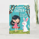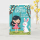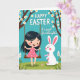 This card shows a spring scene with a young girl with dark hair sitting on a wooden swing hanging from flowering tree branches, her body angled as if she’s gliding toward a dear friend nearby 🌷. She wears a bright pink dress with small dots that stands out against a turquoise sky, and her face is turned with a soft smile as if sharing a private joke. Next to the swing, a fluffy white bunny-like animal stands upright with pink-lined ears and rosy cheeks, gazing up at her with gentle attention 🐰. Slender brown branches stretch across the top and are dotted with white blossoms with golden centers, framing the scene like a canopy. Along the bottom, a green grassy strip is sprinkled with tiny flowers and pale leaf shapes that add a tender, garden-like touch. At the upper center, “HAPPY EASTER” appears in large white letters, and below it a smaller line reads “to a sweet Granddaughter” in a flowing style, also in white. The colors are bright and flat with crisp edges, keeping the focus on the girl, the upright bunny, and the blossoms above. White blossoms with yellow centers cluster along the top branches, with the swing ropes dropping down in front of the turquoise sky.