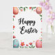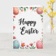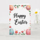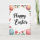 Designed with a tall, vertical layout on a white background, this Easter card centers on the words “Happy Easter” in flowing black lettering. The message sits prominently in the middle, leaving airy space around it so the greeting feels open and inviting 🌷. Around the text, a ring-like border of spring leaves and flowers curls in from the edges, as if gently gathered together by close friends. In the upper corners, blush-pink eggs dotted with golden yellow spots add a soft, sweet touch 🐰. Near the bottom corners, a robin’s-egg blue egg with small pink dots pairs with another pink, yellow-dotted egg to balance the design. Bright fuchsia flowers with sunny yellow centers mingle with pale pink star-shaped blooms and deeper red blossoms, their petals shaded lightly for a tender, romantic look. Green leaves thread between the flowers and eggs, forming a loose wreath around the central lettering.