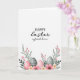 This card features a roomy white background that keeps the focus on a romantic Easter message, with the words set high on the page. “HAPPY” appears first in dark, classic serif letters, and just below it the phrase “Easter my favorite human” is written in a softer, flowing style that feels like a private note between close friends. The text sits in the upper area with plenty of breathing room, making the message easy to read at a glance. Along the bottom edge, leafy green sprigs curl inward like a gentle embrace, dotted with spring flowers in soft pink and creamy off-white 🌷. The blossoms have layered petals and warm centers that add a cozy, affectionate touch to the scene. Nestled among the greenery are glossy egg shapes 🐰 in pale pink and muted sage, arranged like a small gift left for someone special. One green egg shows neat horizontal stripes, while another has tiny white dots, and the flowers cluster around them in a low border across the bottom.