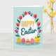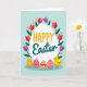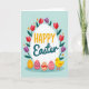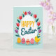 This greeting card features a pale blue background with a large white egg shape centered like a spotlight, setting a fresh spring scene 🌷. Inside the egg, the words “HAPPY Easter” sit prominently, with “HAPPY” in sunny yellow and “Easter” in calm teal, placed right in the middle for easy reading. A circular floral garland wraps around the text, mixing red and purple tulip-like blooms with leafy greens and small golden touches that feel like little shared glances around the message. Beneath the main egg, four smaller decorated eggs line up in a neat row, creating a friendly togetherness like companions standing shoulder to shoulder. Each small egg has its own pattern—gold dots, pink stripes, red zigzags on a creamy base, and bright pink polka dots—adding variety without crowding the layout 🐰. To the side, a tiny yellow chick with an orange beak and feet faces the eggs, as if joining the group with an eager, affectionate curiosity. The garland’s petals and leaves curve smoothly around the central egg, with the gold accents sprinkled between the red and purple flowers.