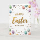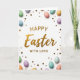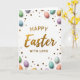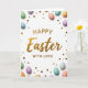 This card features a wide white background that lets the spring details feel light and airy, with a gentle, affectionate mood. Centered in the middle, the words “HAPPY EASTER WITH LOVE” appear in gold lettering with a subtle glittery look, giving the message a warm glow. Around the text, smooth egg-shaped forms in soft mint, pale sky blue, blush pink, and light lavender create a loose wreath that feels like friends gathering close. Each egg shape has a faint, soft-edged shadow, adding depth while keeping the scene calm and sweet 🌷. Scattered between the pastel eggs are small dark-brown dots, like tiny confetti that adds a fun, flirty rhythm without taking over 🐇. The layout keeps the message as the focal point, with the eggs and dots framing it evenly from all sides. The overall lighting stays soft and even, and the brown dots sit in small clusters between the pastel shapes on the white space.