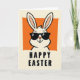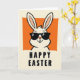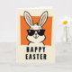 This card features a cartoon-style white rabbit centered on the front, with its upper body rising from a warm orange rectangle like it’s leaning in for a friendly hello 🐰. The rabbit wears dark sunglasses and a small smirk, giving it a cool, flirty confidence that feels like an inside joke shared with a close friend. Two front teeth peek out beneath the smile, and the long ears stretch upward with soft peach tones at the tips, reaching beyond the orange shape as if eager to be noticed. Thick black outlines define the rabbit and add strong contrast against the creamy off-white background. Beneath the illustration, the words “HAPPY EASTER” sit in large, black, all-caps lettering, centered and easy to read. Tiny decorative dots appear near the corners of the orange rectangle, adding a neat accent without crowding the design 🌷. The orange rectangle sits centered behind the rabbit, with small dots marking its corners against the off-white space.
