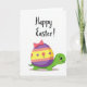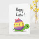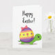 Designed with a cheerful spring scene, this card features a friendly lime-green reptile facing forward with wide eyes, a gentle smile, and soft pink cheeks, as if sharing a sweet hello with someone special 🐇. Its rounded shell looks like a decorated egg, adding a cozy, companionable touch to the character’s pose. The shell is striped horizontally in rich purple, warm peach, and sunny yellow, creating a bright seasonal look. Along the yellow stripe, small pink tulip shapes and tiny purple dots are scattered like little floral notes 🌷. A pink bow sits at the top of the shell, giving the design a tender, gift-like feel. Near the top of the card, the words “Happy Easter!” appear in a flowing purple style, centered above the character. The background stays plain white so the colorful figure and egg-shell pattern stand out clearly. The reptile’s lime-green body and the egg-shell stripes are set against the white space with crisp edges and flat color fills.